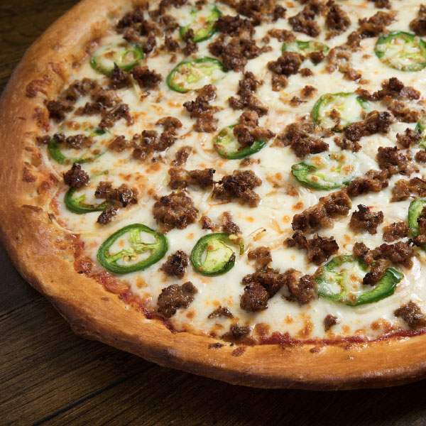 Whole sausage and jalapeno cheese pizza with 2 liter soda.