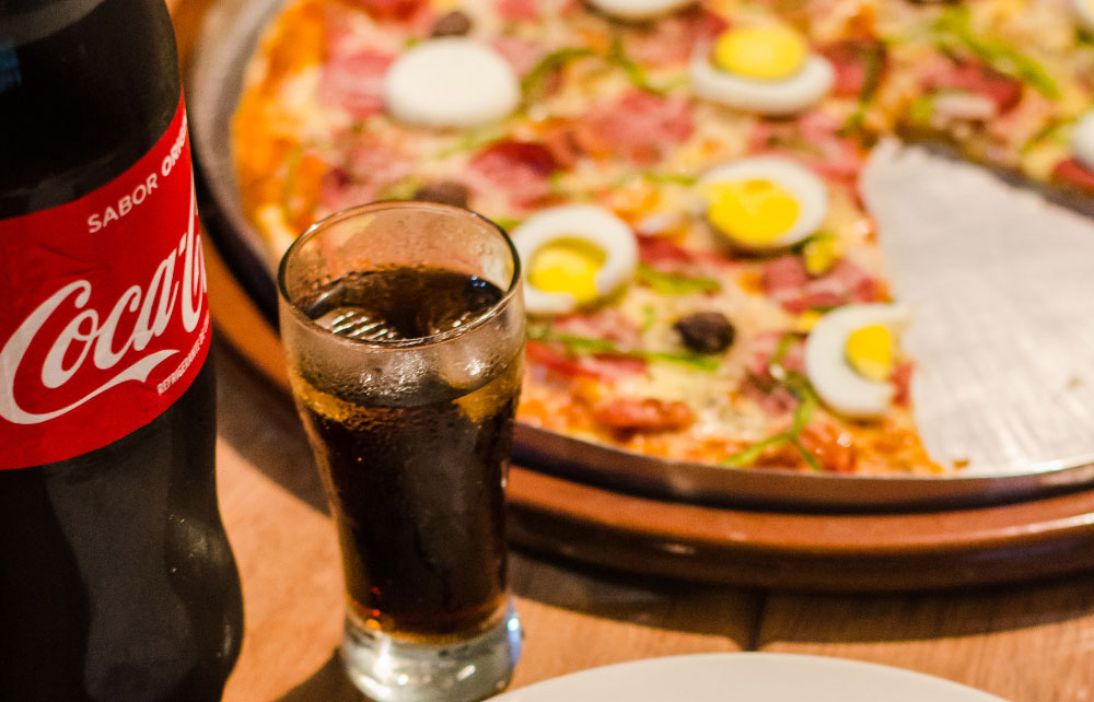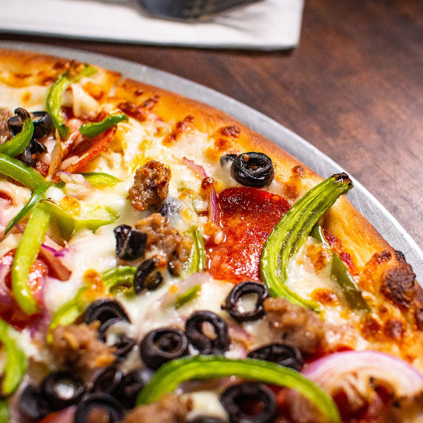 Whole pizza with bell peppers, olives, red onion, sausage, pepperoni, and cheese with 2 liter soda.